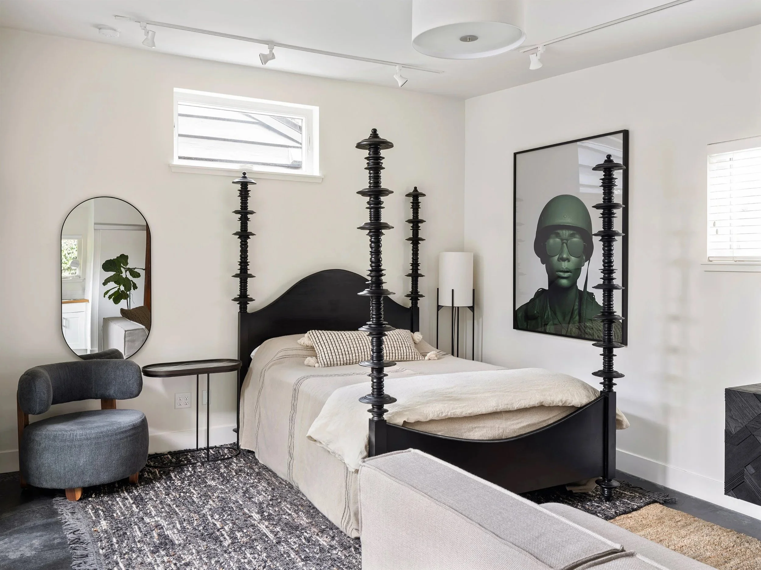 The cover image deserves its own mention. On Airbnb, your thumbnail is your headline. Most hosts photograph the safest version of their space. We led with the most visually distinctive thing in the room: a designer four poster bed and a large scale fine art print from my Uniform series. Conventional wisdom says never put original art in a rental. We saw that convention as the opportunity. Where others were stingy, we chose to be generous. That image stops the scroll. And stopping the scroll is the whole game.